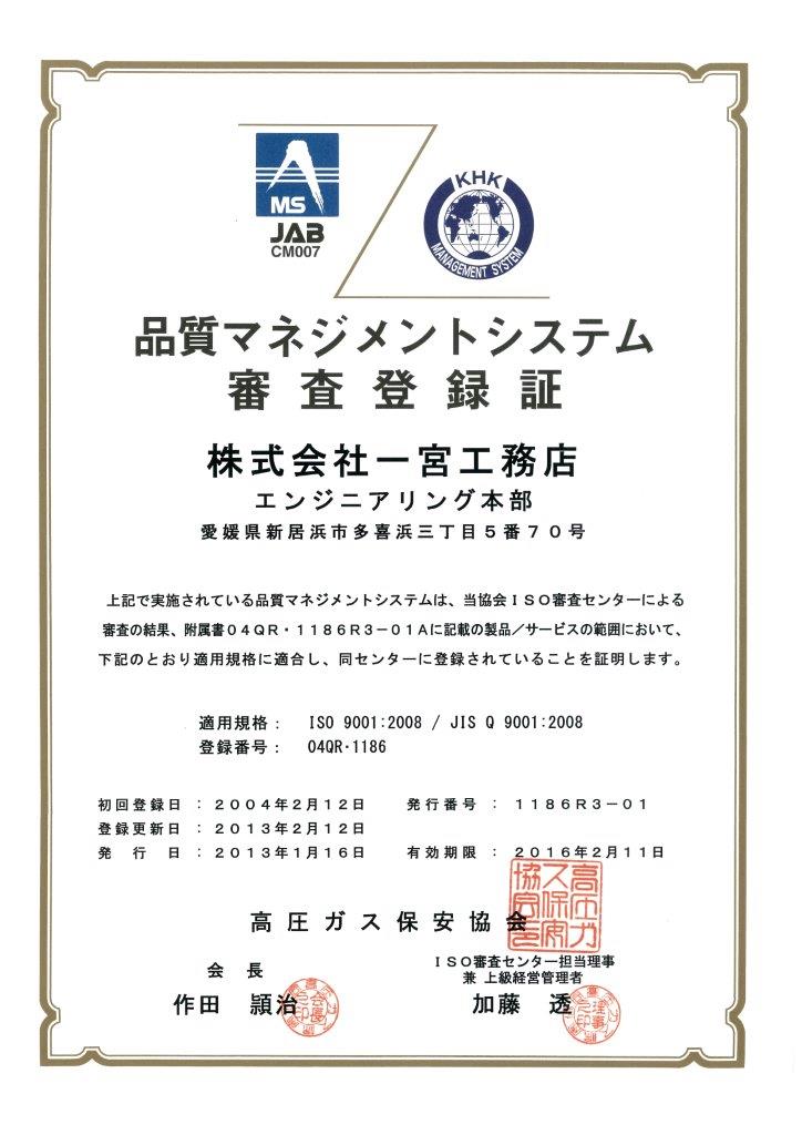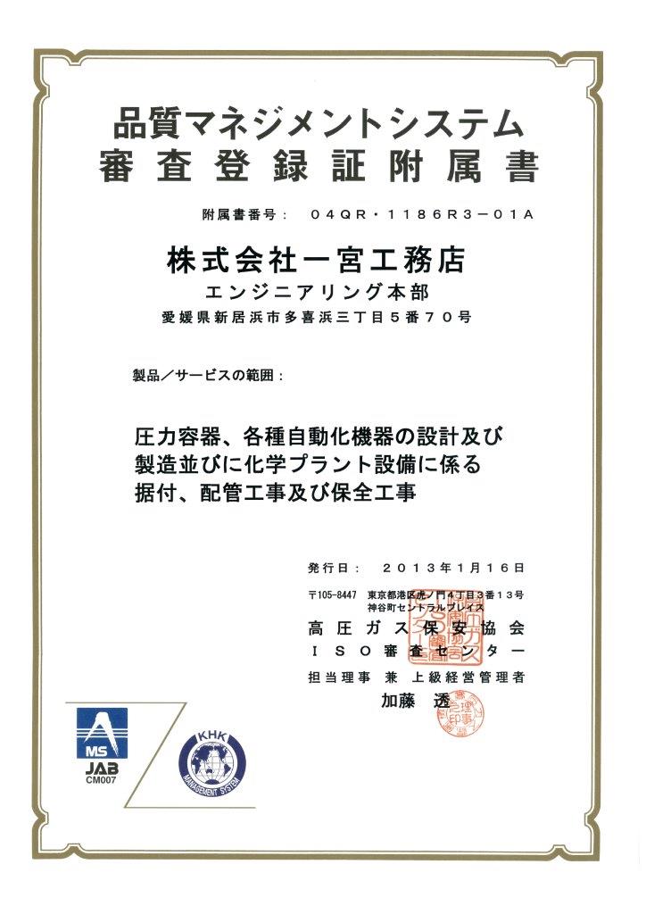 ホーム > 会社案内 > ISO認証 会社情報 部門長挨拶 会社概要/各事業所/アクセス 沿 革 ISO認証 ISO認証 一宮工務店 エンジニアリング本部は ISO9001品質マネジメントシステムを取得しています。 ※画像クリックで拡大表示されます。 品質マネジメントシステム審査登録証(2013年1月更新) 品質マネジメントシステム審査登録証附属書(2013年1月更新)