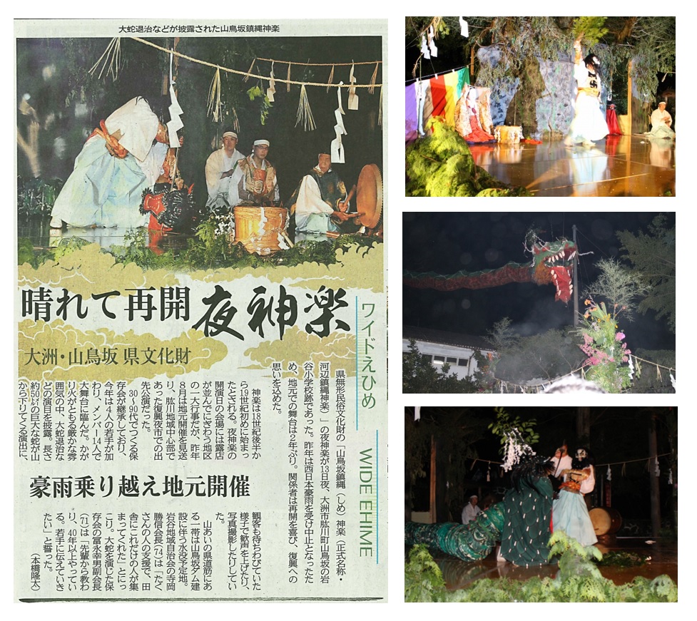 一宮グループ発祥の地、愛媛大洲市で開催される大洲・山鳥坂県文化財「山鳥坂鎮縄神楽」の夜神楽の開催に向け、7月27日の事前清掃と8月13日の当日運営に参加しました。