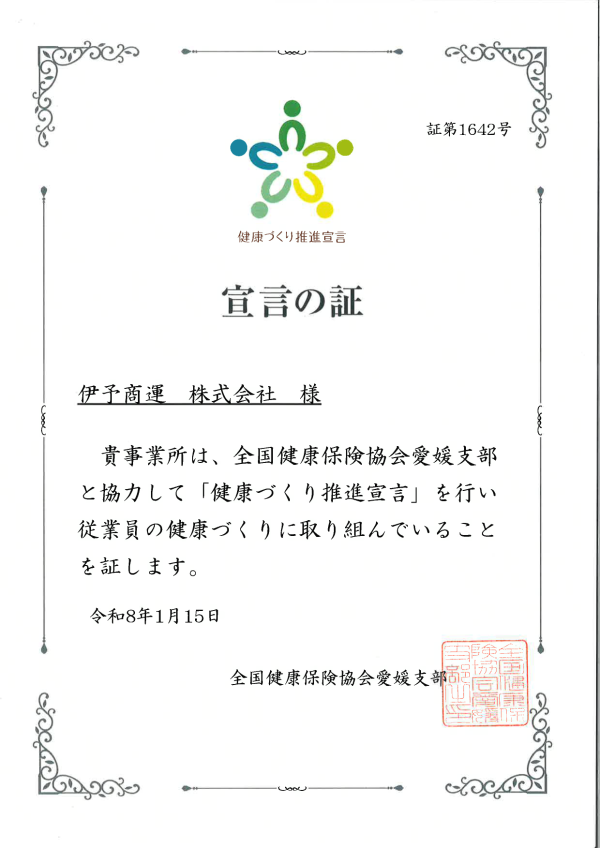2026年2月20日 お知らせ 令和8年1月15日「健康づくり推進宣言」を行いました。 令和8年1月15日付で、全国健康保険協会愛媛支部にて 「健康づくり推進宣言」を行い、従業員の健康づくりに取り組んでいることを宣言しました。