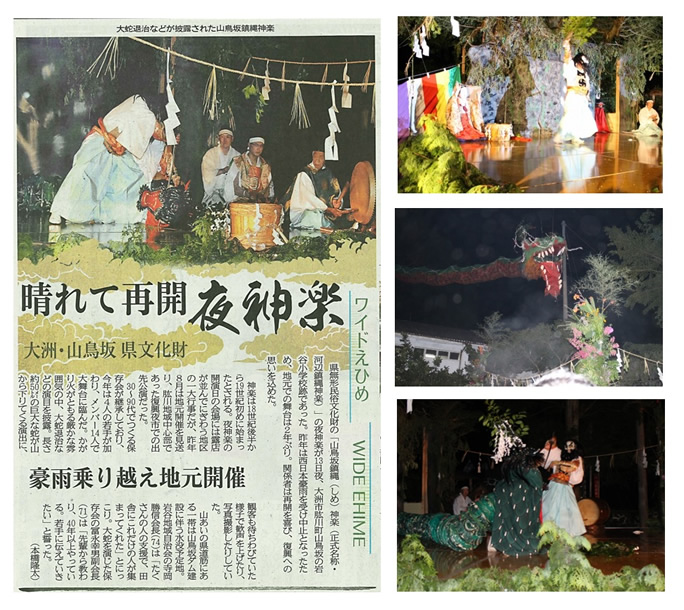 一宮グループ発祥の地、愛媛大洲市で開催される大洲・山鳥坂県文化財「山鳥坂鎮縄神楽」の夜神楽の開催に向け、2019年7月27日の事前清掃と2019年8月13日の当日運営に参加しました。