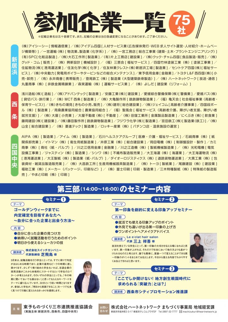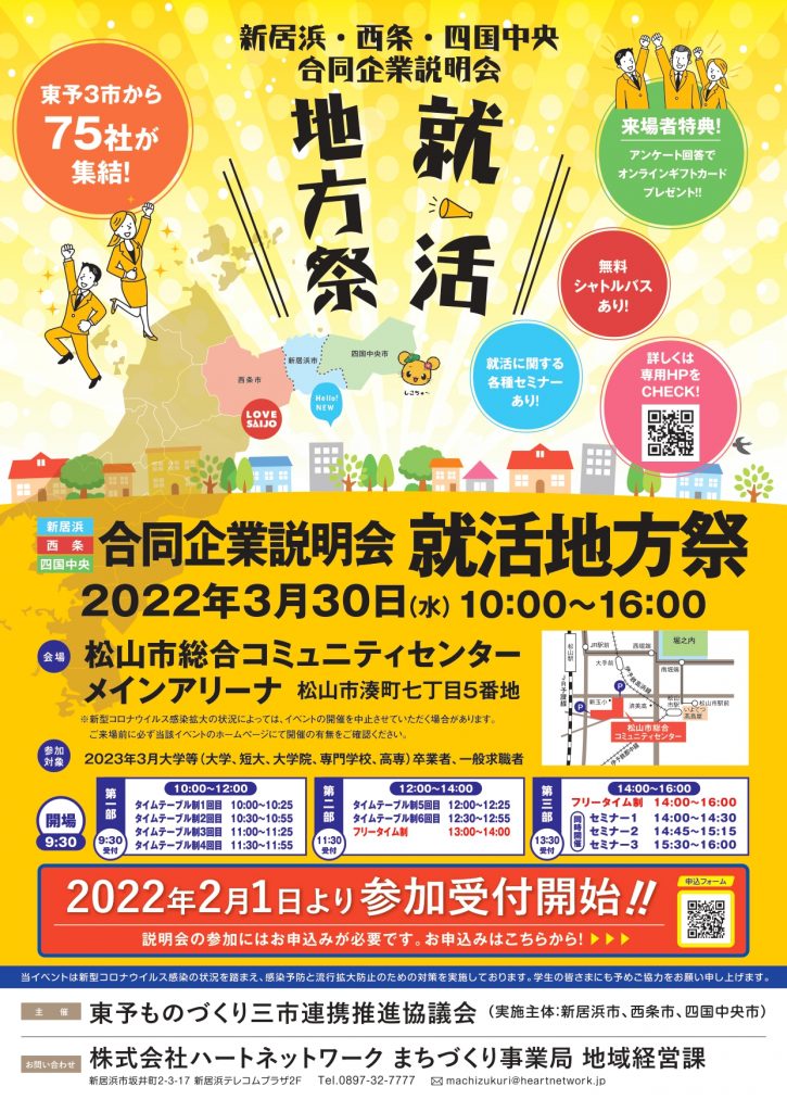 申込方法:※要予約※ こちらから申込お願いします! ⇒ 就活地方祭 新居浜・西条・四国中央 合同企業説明会 2022 (shukatuchihousai.com)