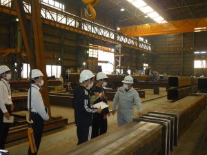 鋼材搬入から出荷までの流れを、2班に別れて工場見学を行ないました。