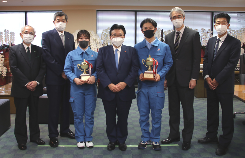 11月9日、第36回全国フォークリフト運転競技大会の一般部門優勝者今村英二選手、女性部門優勝者太治萌葉選手が後藤茂之厚生労働大臣を表敬訪問され、大会優勝を報告しました。