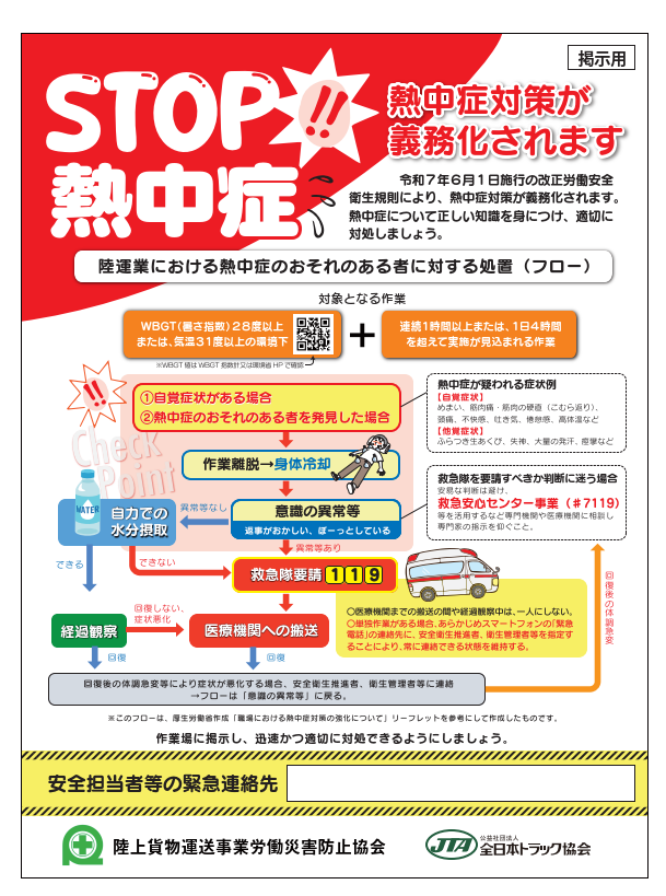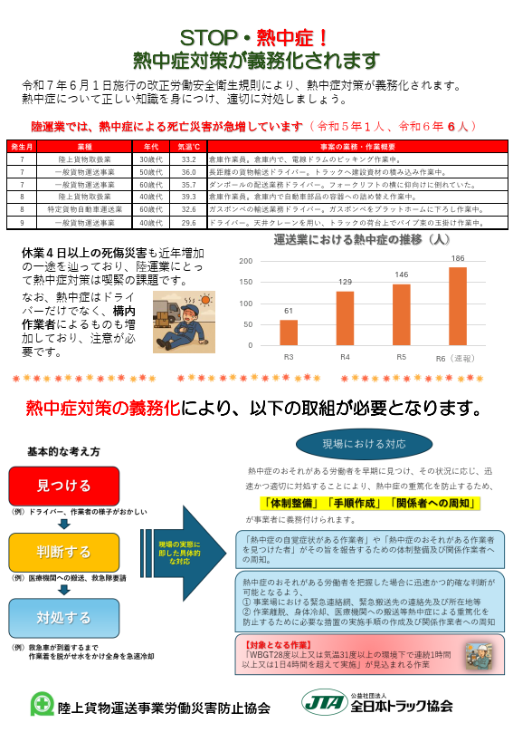 「陸運と安全衛生」熱中症特集記事(令和6年5月~7月号及び令和7年5月・6月号)の当該記事や以下資料及びサイトをご参考の上、熱中症対策に務めていただきますよう、お願いいたします。