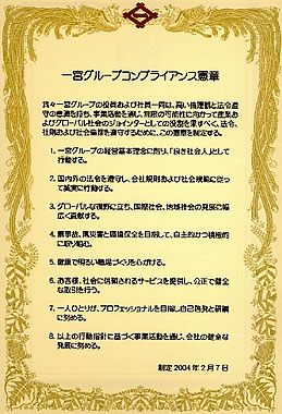 一宮運輸株式会社では、コンプライアンスと自己責任に基づいた企業活動を行うことを自らの社会責任と考え、一宮グループ「コンプライアンス憲章」に則り、高い倫理観と法令遵守の意識を持ち、コンプライアンス制度および組織を設置して事業活動を通じ、無限の可能性に向かって行動いたします。