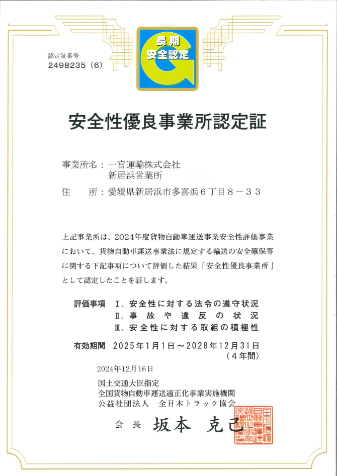 一宮運輸株式会社は、輸送の安全を確保するために、経営トップから現場先端に至る全社員が一丸となって、絶えず安全性の向上に努めて参ります。
